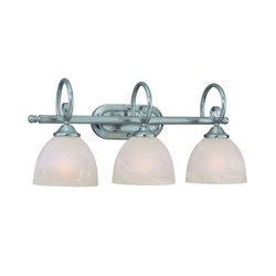 The Raleigh's simplicity of its clean lines and slightly scrolled arms in the body of each fixture makes this family a winner. The hand shaped tubular arms are finished in a Old Bronze and are further accented by the use of a half oval faux alabaster glass shade tinted in an amber tone. This family of Lights is all about value,Bulb Type: Medium Collection: Raleigh Energy Star Compliant: No Finish: Satin Nickel Fixture Type: Vanity Glass: Faux Alabaster Height: 10-1 2 Light Direction: Up Down Material: Metal Number of Lights: 3 Style: Traditional Suggested Room Fit: Bathroom Type: Bathroom Lighting Wattage: 100 Width: 23