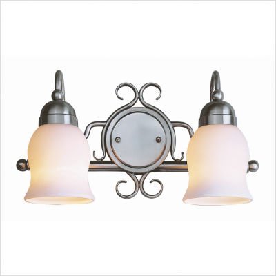2862 ROB Finish: Rubbed Oil Bronze Pictured in satin nickle.The detailed design of the backplate brings this sconce to life. Features: -Two light bath vanity light. -Available in: -Rubbed oil bronze finish. -Satin nickel finish. . -Opal glass. -Mounted up or down. Specifications: -Accommodates (2) 100W medium base bulbs (not included). -UL listed. -Overall dimensions: 9'' H x 17'' W x 7'' D.