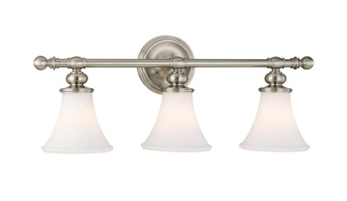 4503-PN Finish: Polished Nickel Pictured in Satin Nickel Features: -Three light bathroom vanity light. -Weston Collection. -Available in polished nickel and satin nickel finishes. -Maybe used as uplights or downlights. Specifications: -Accommodates: 3x100W medium base bulbs (not included). -Backplate dimensions: 5.25'' Dia.. -Overall dimensions: 10''H x 25''W x 7''E.
