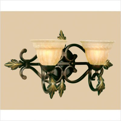 The luxurious bath vanity features A dynamic wrought iron body A bold acanthus leaf motif Elegant diffusers of Golden Glow glass Distinctive Cashmere finish